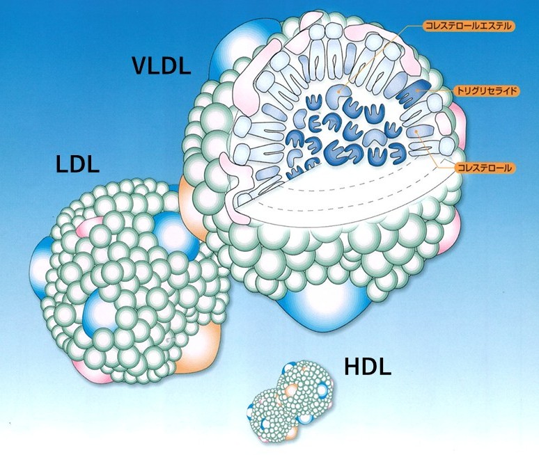 従って水(血液)に溶けるようにタンパク質(リポタンパク質)の服を着て(脂質運搬用ケース:乗物)可溶化されて血中をめぐっています。実はこのリポタンパク質は主 に4種類ありそれぞれ カイロマイクロン(CM)、VLDL、LDL、HDLと呼ばれています。従ってLDL粒子中のコレステロールをLDLコレステロールと呼びHDL中のコレステロールを HDLコレステロールと呼んでいます。LDL粒子やHDL粒子を直接測定することができなかったからです。血液中にコレステロールや中性脂肪(トリグリリライド)等が単独で存在することはあり得ません。
