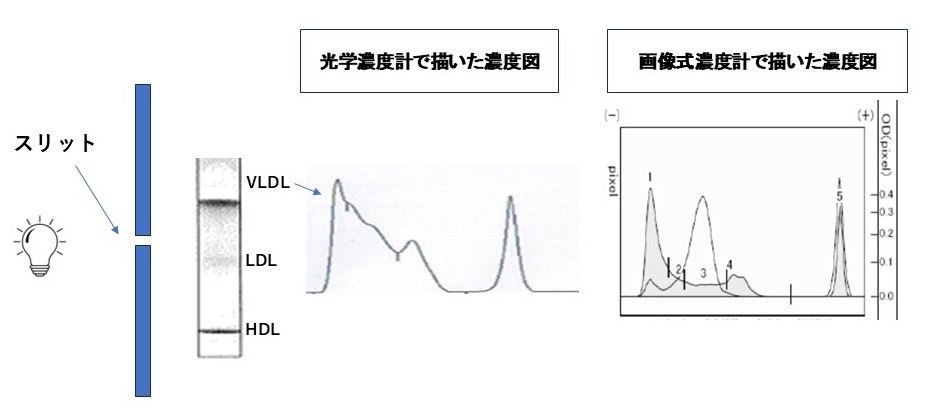 この図をご覧になり、不透明なバンドを持つポリアクリルアミドゲルディスク電気泳動(PAGE)法の濃度計に 光学式濃度計を使うと脂質異常症の診断を間違う恐れがあることを確信して頂けたと思います。